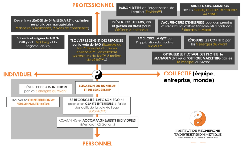 Les outils utilisés par l'Institut de Recherche Taoïste et Biomimétique sont inédits et propres à l'Institut. Ils s'inspirent de la philosophie taoïste ainsi que des lois du vivant et de la nature.